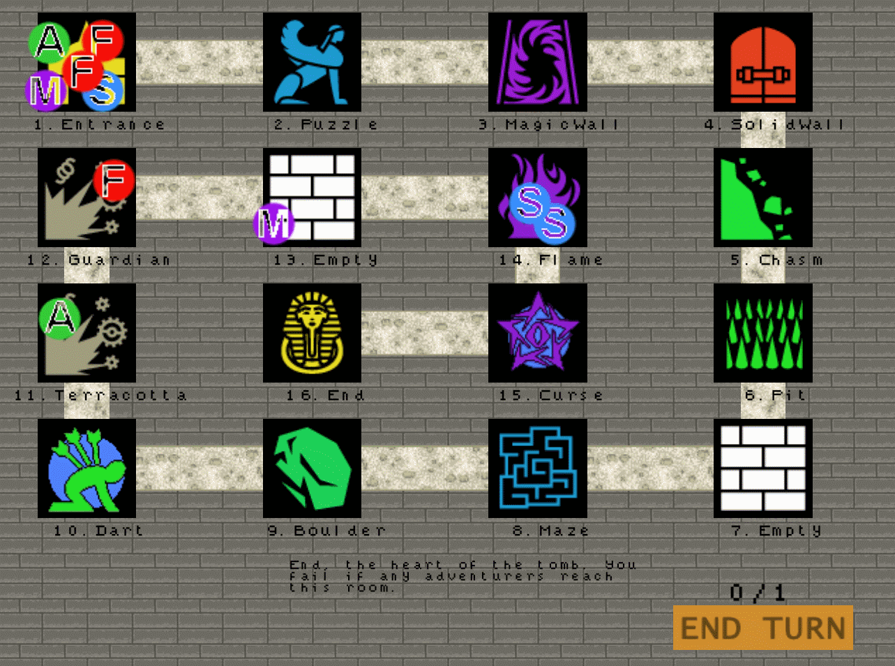 The tomb that the player has to defend has 16 rooms that the invading adventurers have to traverse one by one. The gameplay consists of two phases, first the player places traps in all of the empty rooms. The second phase is turn based, the adventurers will move deeper into the tomb each turn and the player has to stop them by activating traps.